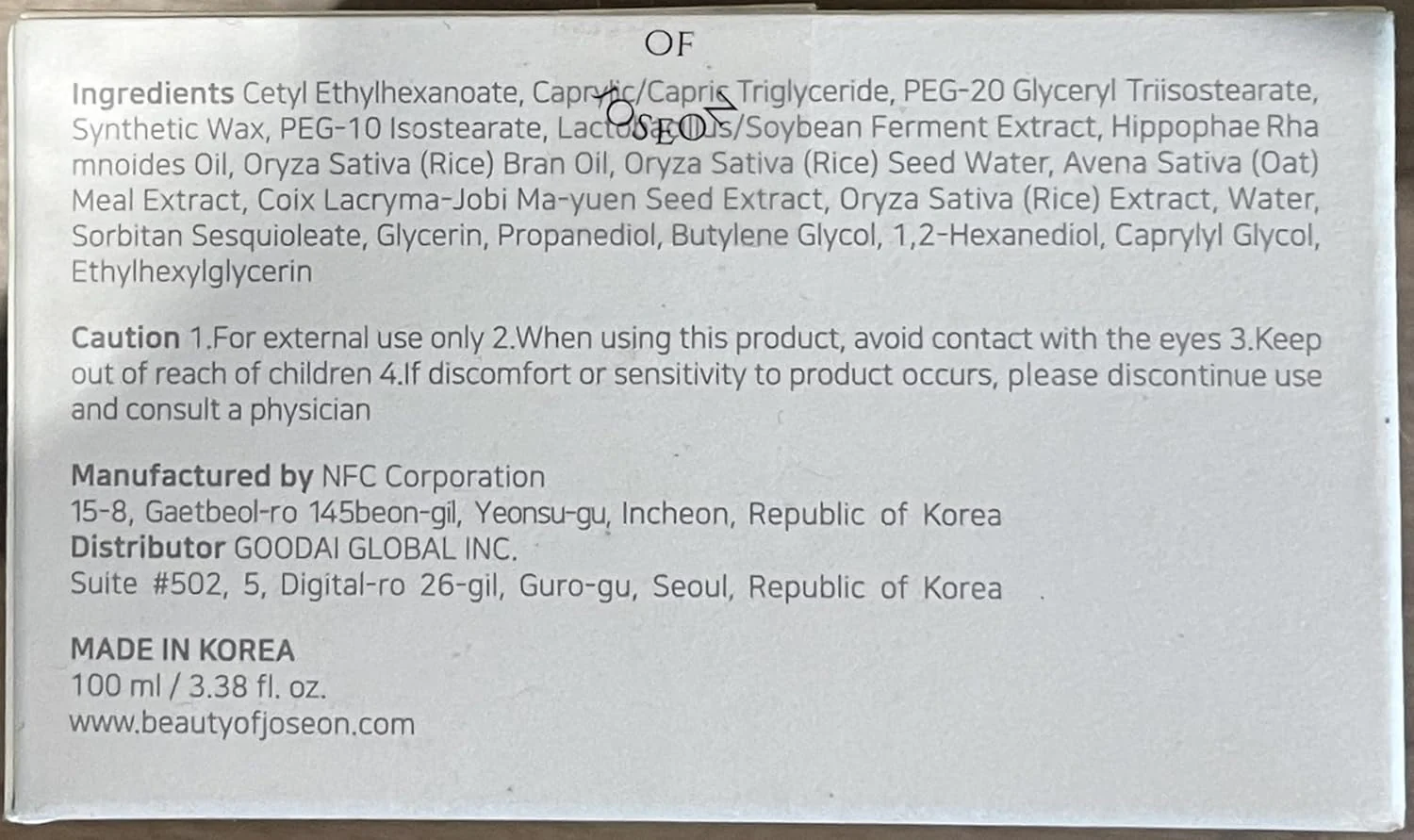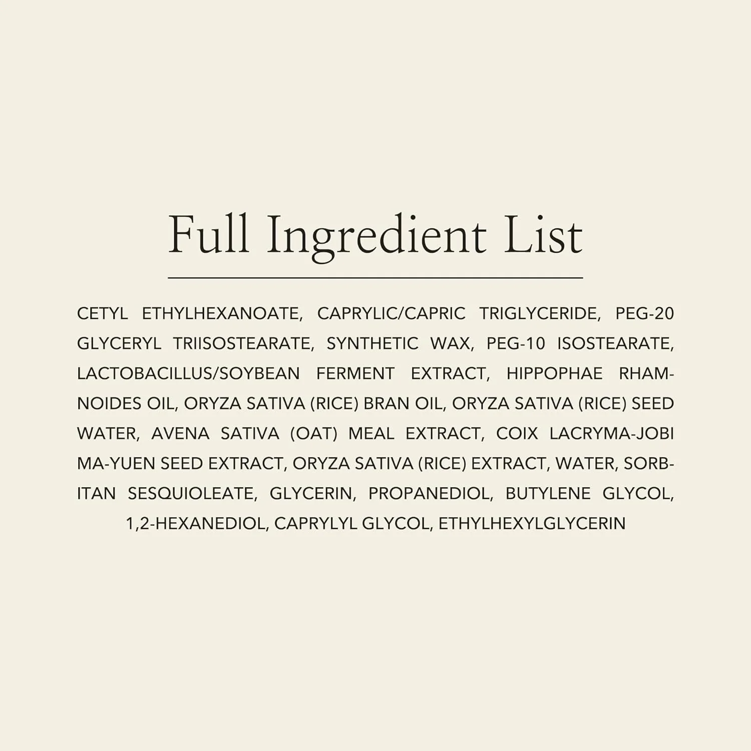 Cetyl Ethylhexanoate, Caprylic/Capric Triglyceride, PEG-20 Glyceryl Triisostearate, Synthetic Wax, PEG-10 Isostearate, Lactobacillus/Soybean Ferment Extract, Hippophae Rhamnoides Oil, Oryza Sativa (Rice) Bran Oil, Oryza Sativa (Rice) Seed Water, Avena Sativa (Oat) Meal Extract, Coix Lacryma-Jobi Ma-yuen Seed Extract, Oryza Sativa (Rice) Extract, Water, Sorbitan Sesquioleate, Glycerin, Propanediol, Butylene Glycol, 1,2-Hexanediol, Caprylyl Glycol, Ethylhexylglycerin