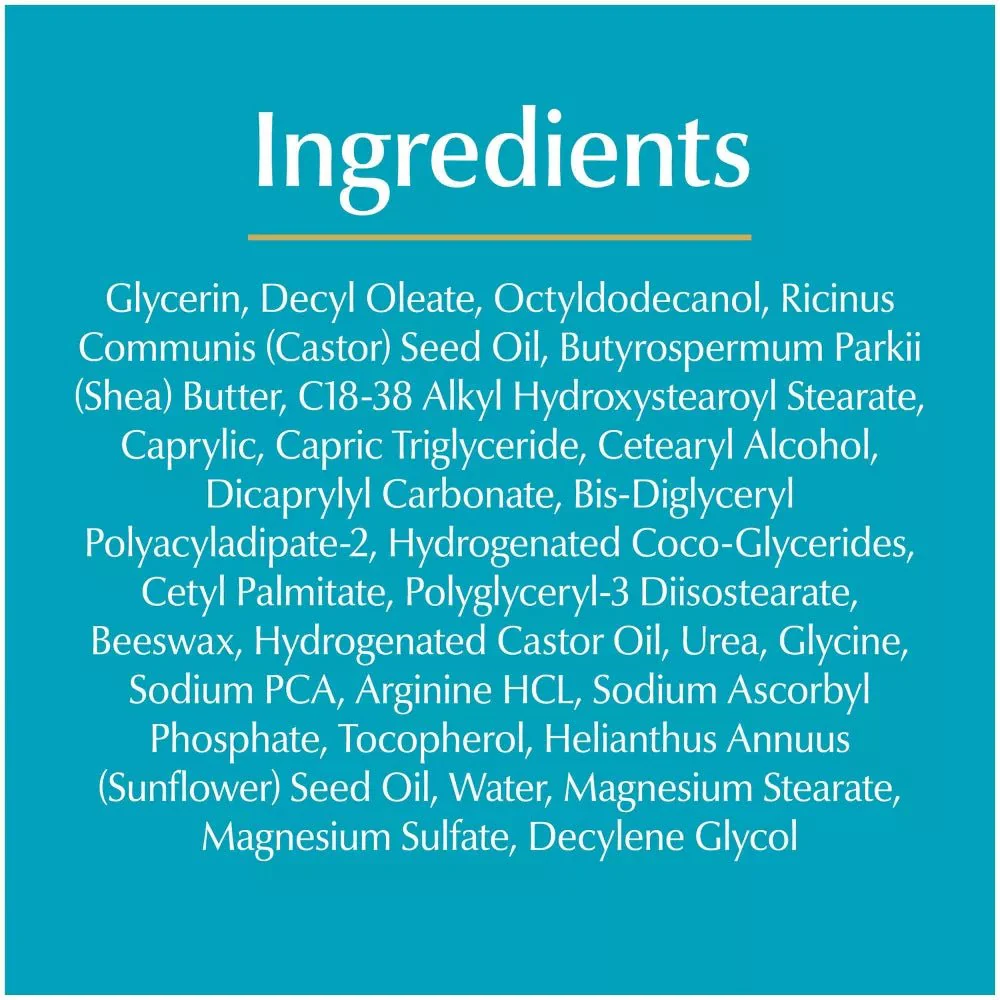 Glycerin, Decyl Oleate, Octyldodecanol, Ricinus Communis (Castor) Seed Oil, Butyrospermum Parkii (Shea) Butter, C18-38 Alkyl Hydroxystearoyl Stearate, Caprylic/Capric Triglyceride, Cetearyl Alcohol, Coco-Glycerides, Cetyl Palmitate, Polyglyceryl-3 Diisostearate, Beeswax, Hydrogenated Castor Oil, Urea, Glycine, Sodium Pca, Arginine Hcl, Sodium Ascorbyl Phosphate, Tocopherol, Helianthus Annuus (Sunflower) Seed Oil, Water, Magnesium Stearate, Magnesium Sulfate, Decylene Glycol