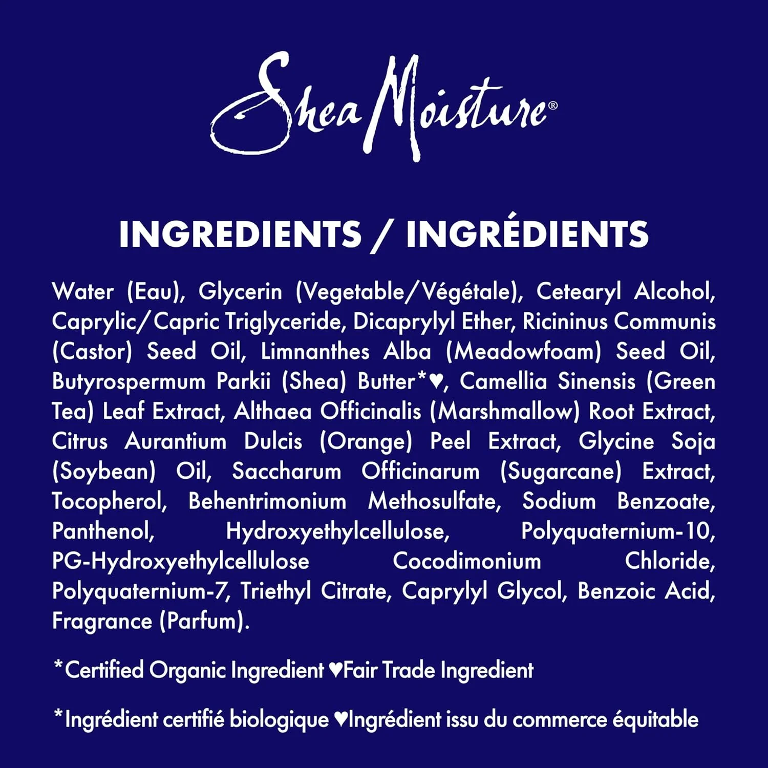 – Sugarcane Extract & Meadowfoam Seed. Water, Cetearyl Alcohol, Glycerin (Vegetable), Caprylic/Capric Triglyceride, Dicaprylyl Ether, Polyquaternium-7, Panthenol, Behentrimonium Methosulfate, Limnanthes Alba (Meadowfoam) Seed Oil, Ricinus Communis (Castor) Seed Oil, Butyrospermum Parkii (Shea) Butter* ª´, Saccharum Officinarum Extract, Citrus Aurantium Dulcis (Orange) Peel Extract, Camellia Sinensis (Green Tea) Leaf Extract, Althaea Officinalis Root Extract, Triethyl Citrate, Caprylyl Glycol, Benzoic Acid, Polyquaternium- 72, Hydroxyethylcellulose, Sodium Benzoate, Fragrance (Essential Oil Blend) *Certified Organic Ingredient ´Fair Trade Ingredient